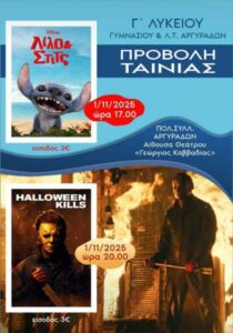 Ο Πολιτιστικός Σύλλογος Αργυράδων σας προσκαλεί σε κινηματογραφική βραδιά στην αίθουσα “Γεώργιος Καββαδίας” στις Αργυράδες. ΠΡΟΒΟΛΗ ΤΑΙΝΙΩΝ από τη Γ’ Λυκείου Γυμνασίου & Λ.Τ. Αργυράδων! Σάββατο 1…