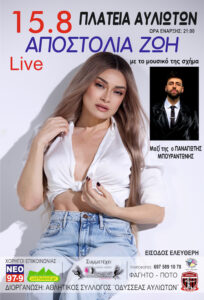 Την Παρασκευή 15 Αυγούστου στην πλατεία Αυλιωτών ζωντανά με την Αποστολία Ζώη από τις 21:00 με το μουσικό της σχήμα Μαζί της ο Παναγιώτης Μπουραντώνης. Είσοδος ελεύθερη. Συμμετέχει η σχολή…