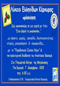 🎄 Εκδήλωση: «Στου βοριά το μπαλκονάκι…» – Λύκειο Ελληνίδων Κέρκυρας | 7 Δεκεμβρίου 2025 Το Λύκειο Ελληνίδων Κέρκυρας διοργανώνει μια ξεχωριστή χριστουγεννιάτικη γιορτή με τίτλο «Στου βοριά το μπαλκονάκι…». Μια…
