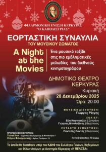 Η Φιλαρμονική Ένωση Κέρκυρας «Ο Καποδίστριας» παρουσιάζει την εορταστική της συναυλία με τίτλο «A Night at the Movies», μια μοναδική μουσική παράσταση αφιερωμένη στις πιο εμβληματικές μελωδίες του διεθνούς κινηματογράφου.…
