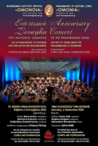 Επετειακή Συναυλία του Μουσικού Σώματος Για τη συμπλήρωση 127 χρόνων από την ίδρυση της Φιλαρμονικής Ομόνοιας Γαστουρίου στο πλαίσιο της Γιορτής Μουσικής Κέρκυρας 2025. Τοποθεσία: Υπαίθριο Θέατρο "Ρένα Βλαχοπούλου".  …