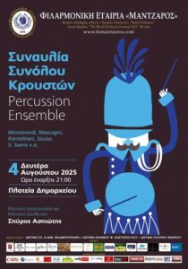Συναυλία Συνόλου Κρουστών Percussion Ensemble Monteverdi, Mascagni, Kantelinen, Sousa, S. Saens κ.α. Δευτέρα 4 Αυγούστου 2025 Ώρα έναρξης 21:00 Πλατεία Δημαρχείου Μουσική προετοιμασία και Μουσική Διεύθυνση: Σπύρος Απιώτης ΦΙΛΑΡMONΙΚΗ ΕΤΑΙΡΙΑ…