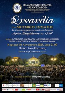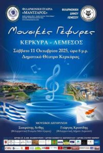 «Φ.Ε. ΜΑΝΤΖΑΡΟΣ» & «ΦΙΛΑΡΜΟΝΙΚΗ ΔΗΜΟΥ ΛΕΜΕΣΟΥ» ΚΥΠΡΟΥ   Η Φιλαρμονική Εταιρία «Μάντζαρος» παρουσιάζει κοινή συναυλία με τη Φιλαρμονική του Δήμου Λεμεσού (Κύπρος), το Σάββατο 11 Οκτωβρίου 2025, στις 20:00, στο…