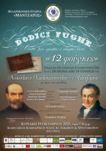 «12 Φούγκες» – Επετειακή συναυλία για τα 230 χρόνια από τη γέννηση του Νικολάου Χαλικιόπουλου – Μάντζαρου   Το έτος 2025 σηματοδοτεί τη συμπλήρωση 230 ετών από τη γέννηση του…