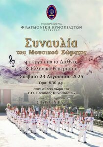 Συναυλία του Μουσικού Σώματος της Φιλαρμονικής Κυνοπιαστών το Σάββατο 23 Αυγούστου 2025. Στον Αύλειο χώρο Υ.Θ. Ελεούσης Κυνοπιαστών. Διευθύνει ο Αρχιμουσικός Σπύρος Νίκας. Ώρα έναρξης: 8:30 μ.μ.