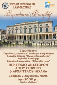 Χορωδιακό Φεστιβάλ από τη Χορωδία Ευρωπούλων Ι. Καποδίστριας Συμμετέχουν: Χορωδία εξωραϊστικού συλλόγου Καββαδάδων Χορωδία Χλομού "Θωμάς Παλαιολόγος" Χορωδία πολιτιστικού συλλόγου Νυμφών Χορωδία Λευκίμμης Χορωδία Ευρωπούλων "Ι. Καποδίστριας" Στο Περιστύλιο Ανακτόρων…